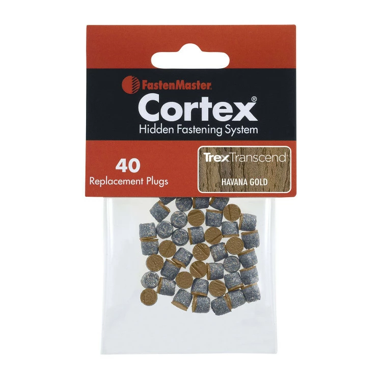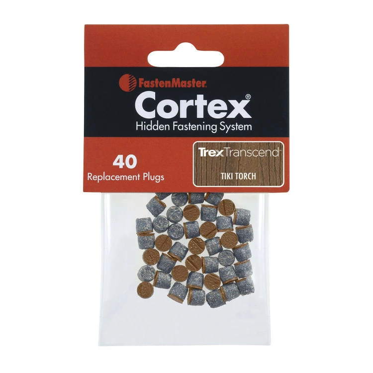 The FastenMaster Cortex Replacement Plugs for Trex Decking are made from actual Trex deck boards to provide an exact match to the color and grain of your Trex deck. One bag includes 40 loose plugs.