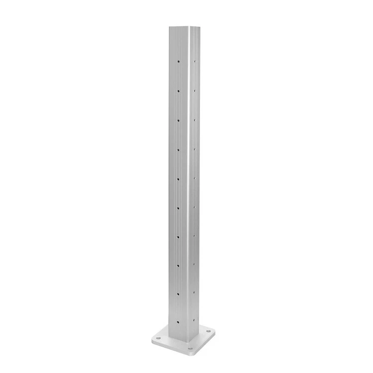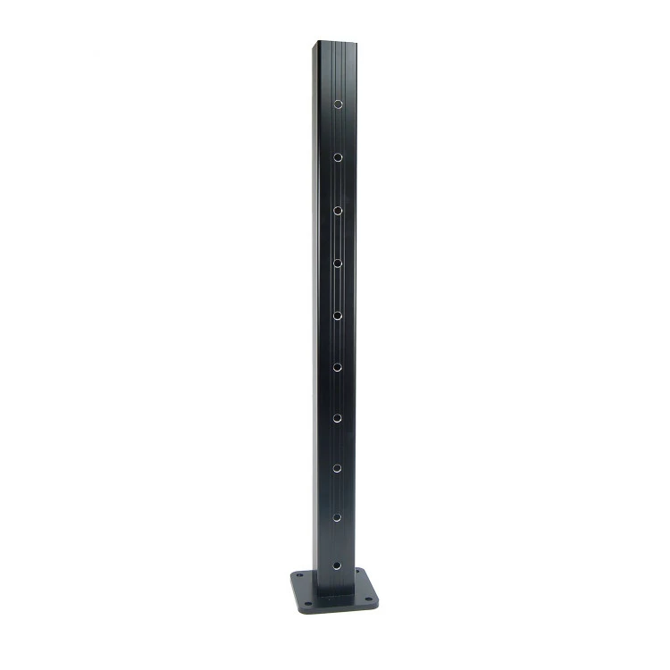 The RailFX Surface Mount Post for Horizontal Cable Railing – 2-3/8″ x 35″ is a square surface mount post. There are 10 holes for 36” rail height. The 5” base plate and bolt cap covers are included. Base plate holes for fasteners are 3/8”. Pre-drilled post is drilled at 3-3/16” on center spacing engineered to meet code. Posts must be placed at no more than 60” on center spacing. Fasteners for mounting the base plate to the deck are sold separately.