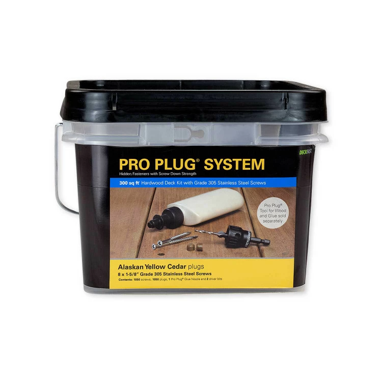 All of the Pro Plug System for Wood components have been carefully and precisely engineered to maximize performance and provide the best finished result. The system features face-grain wood plugs, grade 305 stainless fasteners, a pre-drilling and counterboring tool, and a glue nozzle that applies glue to the sidewall of the counterbored hole. Glue sold separately.