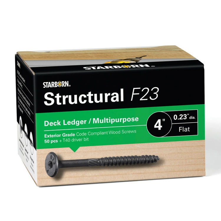 Structural F23 Multi-Purpose Flat Head Wood Screws are designed for heavy duty framing applications such as decking, fencing, pergolas, landscape timbers, and timber framing. The 4″ and 5″ lengths are specifically designed as code compliant deck ledger attachments.