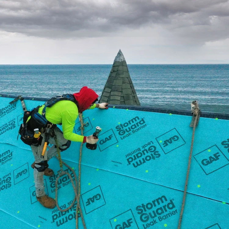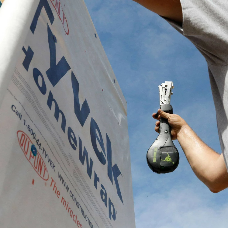 With this system, every nail is automatically driven through a small, circular plastic cap that effectively seals the holes created by the fastener. This ensures that no water will leak through the underlayment or housewrap because of holes left by the fasteners. In addition, capped staples provide 20 times the holding power of non-capped staples, even though fewer fasteners are actually needed.