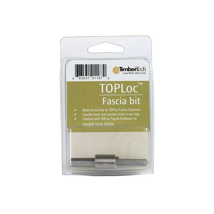TimberTech TOPLoc Fascia Bit is designed with efficiency, quality, and your deck’s clean appearance in mind. This unique fascia bit—made exclusively for TOPLoc Fascia Fasteners—overdrives and countersinks the fascia fastener hole in one step, while significantly reducing oil-canning. Save installation time by using this bit that pre-drills and overbores through the hole simultaneously. Only compatible with TOPLoc Fascia Screws for TimberTech PRO and EDGE boards.